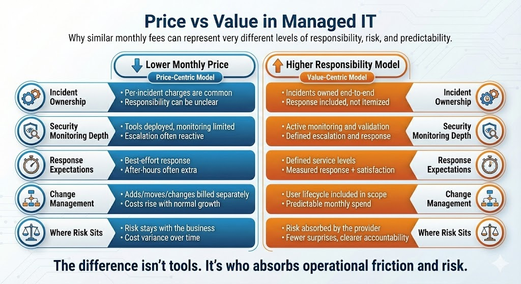 From a leadership perspective, the real question isn’t “What does managed IT cost?” It’s “What business risk does this cost actually absorb?”