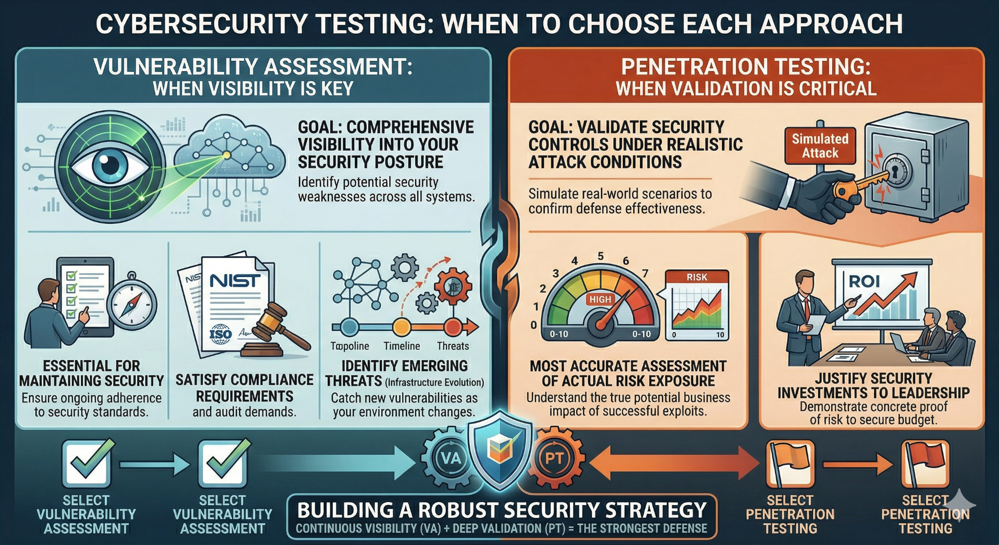 Choose penetration testing when you need to validate security controls under realistic attack conditions. This approach provides the most accurate assessment of your actual risk exposure and helps justify security investments to leadership.