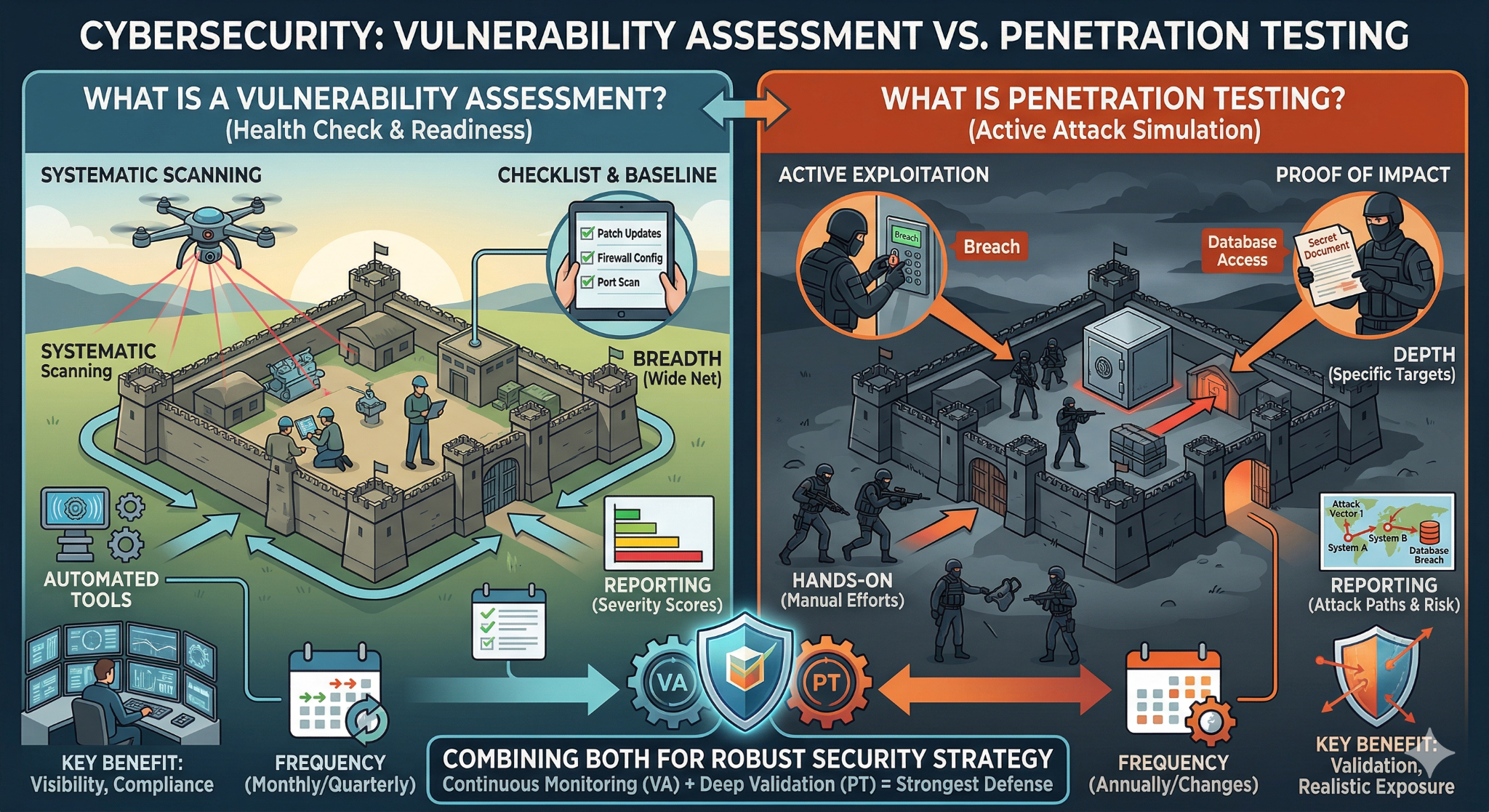 In this guide, you'll learn the practical differences between these approaches, when to use each method, and how combining both creates a robust cybersecurity strategy that protects your business and satisfies compliance requirements.